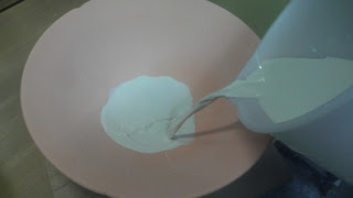 薄く溶いた透明釉を鉢の中心部に注ぎ込みます。