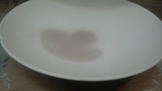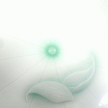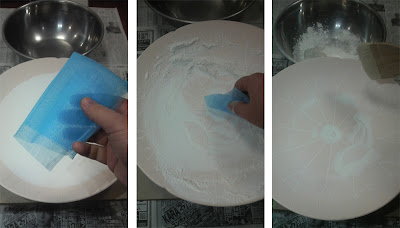 乾燥した釉薬表面を台所の排水溝へ被せるネット(スーパーで売ってるヤツです)で軽く擦って余分な釉薬を落とします。刷毛で粉を飛ばせば写真のような状態です。彫りの深い所に釉が残った状態になります(見づらい場合、写真をクリックすれば大きく見えます)