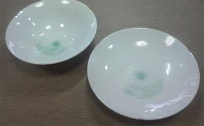 皿の内側にも釉薬を掛けたら見こみの中心部と彫りを施した花弁部分に青白釉を吹き付けます。
