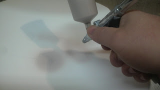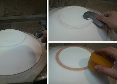 コンプレッサーとスプレーガンで透明釉を全体に吹き付けて乾燥。高台に付いた釉薬をアルミのコテで削って、水を含ませたスポンジで拭き取ります。