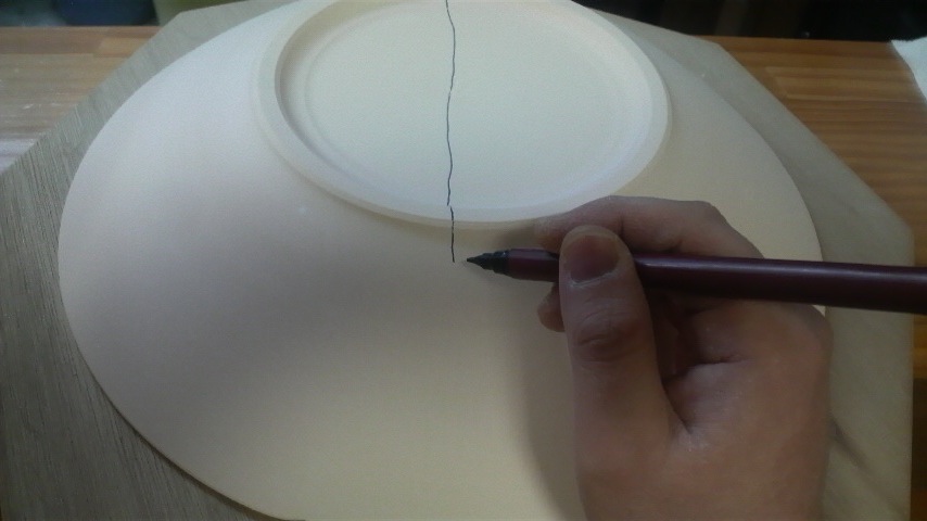 焼けば消えるので目印になれば線でも好きな韓流スターの名前でも何でもいいと思います。油性ペンだと釉を弾いてしまうらしいので焼いた後に「ソン・スンホン」とか文字が出てきてもボクは責任は取れません。。