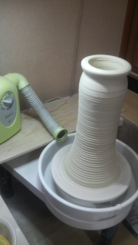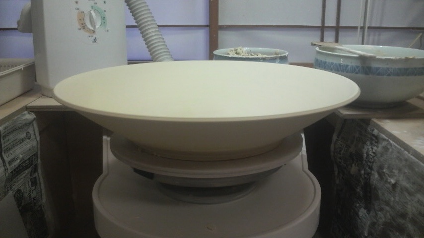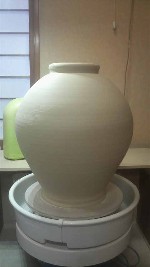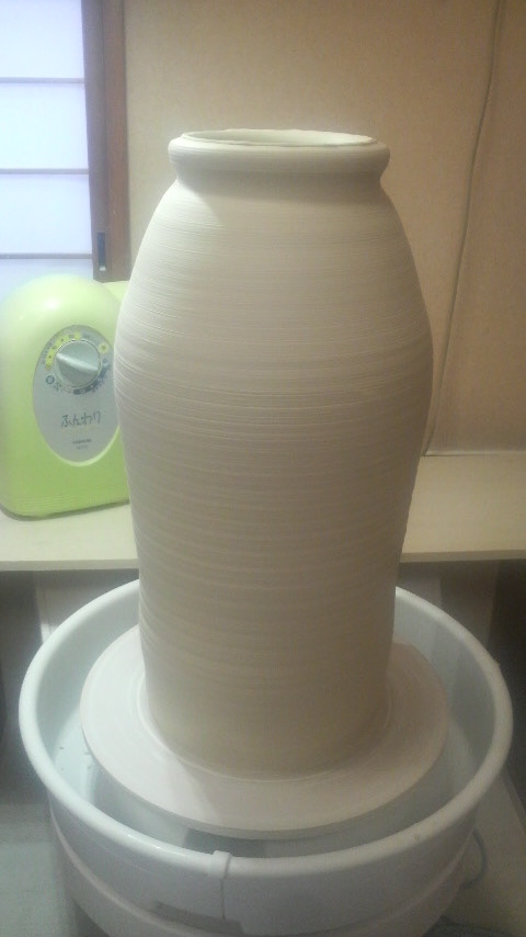 大壺ロクロ挽き完成です。寸法を測ってみたら直径46cm、高さ40cmでした。 ゆっくりロクロを回しながら1日乾燥させます。その後、また室へ移動。