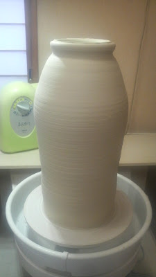 この段階で直径40cm、高さ45cmくらいだったかな〜。首は筒のときの形のままを残しながら挽いています。少し口を反らしておいた方が、胴〜肩を膨らませる時に歪みにくくなります。
