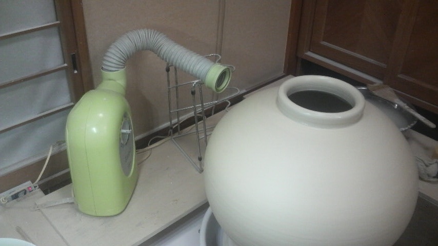 完成近く膨らんだら、今度は口を作るため、肩の方へ布団乾燥器をあてます。胴〜肩は薄くなってるのでいきなり硬くなった口を触ると全体が歪みやすいのです。乾燥機で乾かして形を丈夫にしておきます。