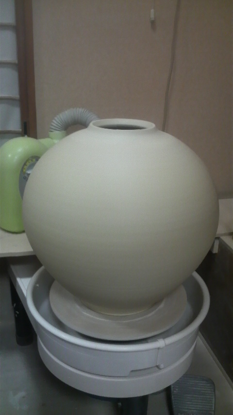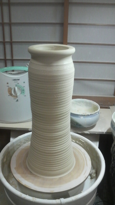 壺を膨らませてる時間、隣のロクロでは木曜日に膨らませる予定の筒を制作。
