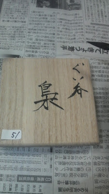 学生時代、大学の先生が書いてらしたのを柱の陰からジ〜っと観察したところ作品名は箱の表に書いて、