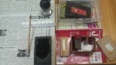 硯に少量ずつ水を落としながら墨を擦って、こちらもスタンバイ完了。
