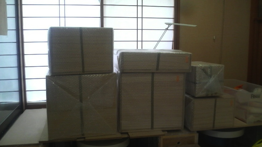 パッキンを開けて紐を解き、箱書きが出来る状態でスタンバイ。箱の上下を確認しながら出品リストの番号のシールを蓋の左下に貼って、番号順に並べます。