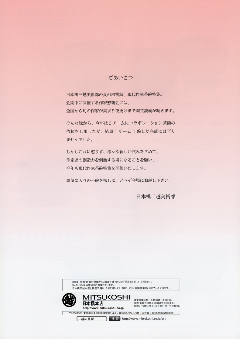 15日(水)から日本橋三越本店にて『現代作家茶碗特集』が開催されます。