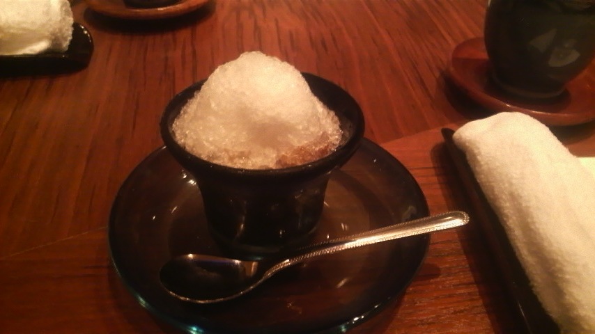 デザートは黒蜜のゼンザイ。かき氷の下に小豆と白玉、黒蜜が潜んでいます。
