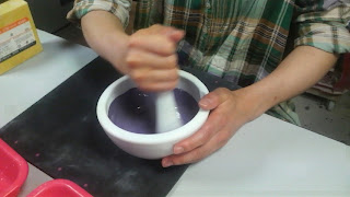 粘土をいじる前に顔料を乳鉢でよ〜く擦って下準備。ボク含めた3人は紫色。